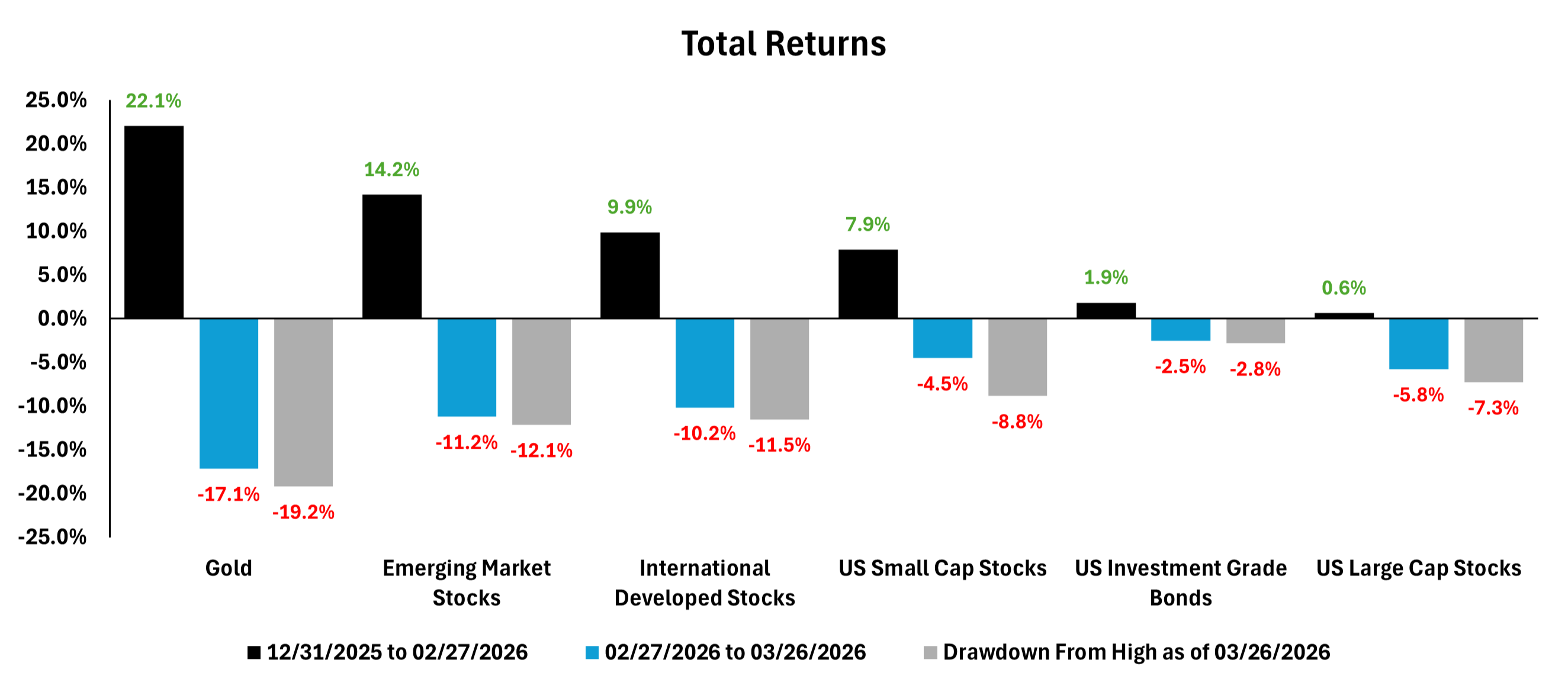 Equities have followed a similar, though less severe, path. The S&P 500 has experienced a peak-to-trough drawdown of around 7%, while gold, emerging markets, and international developed stocks have fared worse, all down double digits from their highs and giving back their year-to-date gains. Part of that divergence reflects greater exposure to energy costs abroad, along with the impact of higher real yields and a stronger US dollar on assets like gold.