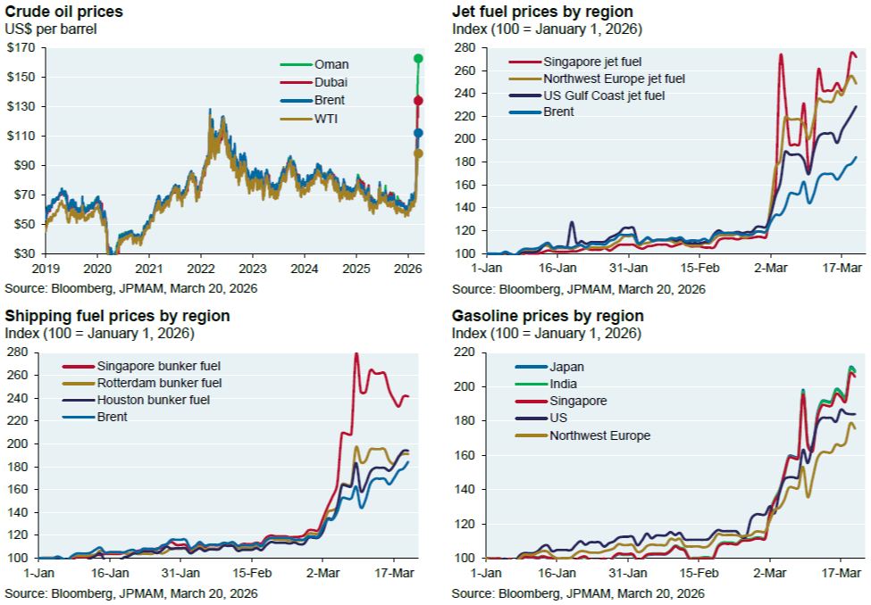 In past energy shocks, refined products like jet fuel, diesel, and gasoline often rise faster than oil itself, and that dynamic is showing up again.