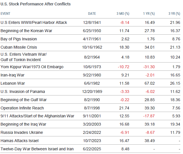 Over time, returns have more often than not been positive following major geopolitical events, even over relatively short horizons. Extend that timeframe to several years, and the consistency of positive outcomes becomes even more apparent.